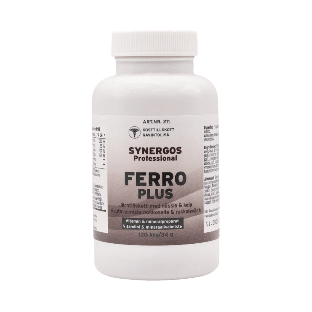 Ferro Plus är ett järntillskott som kombinerar järn med nässla, kelp, C-vitamin och zink. Varje tablett innehåller 20 mg elementärt järn tillsammans med utvalda näringsämnen i en praktisk form som gör produkten enkel att använda dagligen.