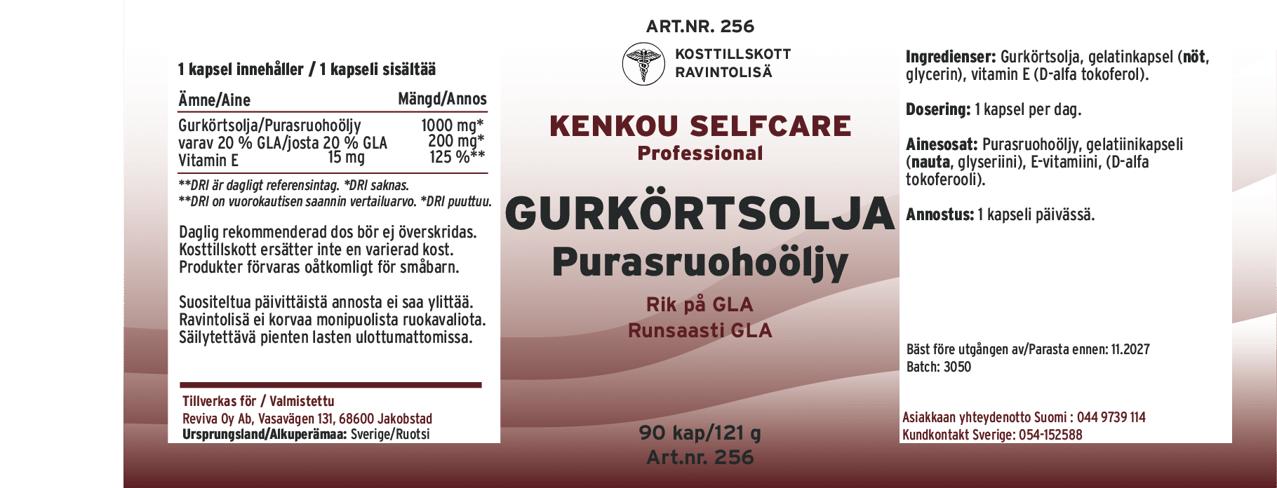 Gurkörtsolja från Kenkou Selfcare framställs ur frön från gurkört (Borago officinalis). Oljan innehåller GLA (gammalinolensyra), en omega-6-fettsyra som även förekommer i andra växtkällor. Tack vare kapselformen blir produkten enkel att dosera och smidig att använda i vardagen.