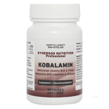Kobalamin från Synergos Nutrition kombinerar metylkobalamin (vitamin B12) och folat i sin aktiva form 5-MTHF (metyltetrahydrofolat). Kombinationen av metylkobalamin och 5-MTHF gör produkten särskilt lämplig för dig som vill ha ett lättupptagligt och metylerat tillskott.